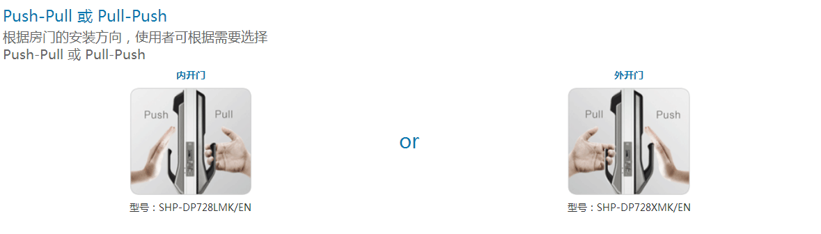 根据房门的安装方向,使用者可根据需要选择Push-Pull 或 Pull-Push